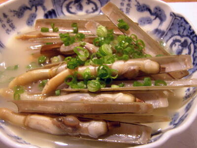 いろいろ話を聞くついでに当然地元料理も頼む。まずはマテ貝のバター焼き。東京では食えない味。
