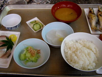 さて次の目的地は鮎料理が食える「ひのきや」。ノリ憎号は別行動に。烏山駅前交番で道を聞いてようやく「ひのきや」到着。時刻は13時。すぅさん、さおりんさん、さぎりちさんはすでに食べ終えてた。自分が頼んだのは鮎の刺身付きの鮎定食+生ビール。