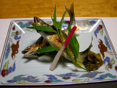 鮎の塩焼き。湯涌温泉は山間なんで期待した「金沢の海の幸」は刺身だけだった。