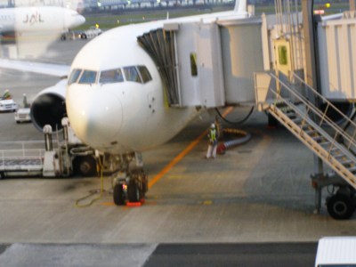 今日は大日本、DDT、KAIENTAI-DOJOの合同興行「三位一体の術」広島大会。広島行くのは飛行機にするか新幹線にするかいつも迷うところだが、今回は三原市の新高山城に行くことにしたので飛行機で。6時55分発のJALに乗るのに家は5時出、千代田線、山手線、京急快特と乗り継いで6時過ぎに羽田着。羽田のマックで朝マックしようと思ったらなんとこのマックには客席がない。しかたがないので立ち食い。チケットレスなので早く行く必要はあんまりないのだがどうしても早め早めに行動するくせは抜けず、6時25分には搭乗口に。時間があるので飛行機の写真も撮ったりして。