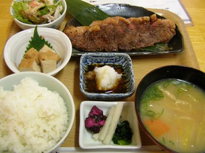 麓に下りたのは11時半。途中で昼飯を何も仕入れてなかったので、次に行く古高山城への登山道を聞きがてら食堂で昼飯を食うことに。橋のたもとにあった「味処きらく」で峠下牛(広島・竹原のブランド牛らしい)のステーキ定食。ブランド牛と言っても特に違いはわからず。結局食堂では道がわからず、本郷交番にも駐在がいなかったので歩いていたおばあちゃんに聞く。