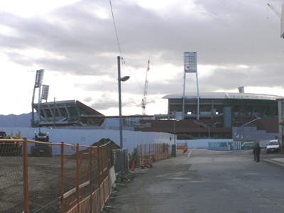 本日の計画としては晴れたら0系ラストランを山口のお立ち台まで撮りに行くというのを考えていた。が、昨日寝る前に雨降ってたのでそれは断念、寝ることに。起きたら晴れていた。あれー?まあ仕方ない。そこまでのテツではないということだ。変更後の計画は朝飯としてお好み焼きを食べてから九州に移動、ということで駅ビル「asse」の11時開店を待つ。その前に駅の近くに建設中の新広島市民球場に。まだまだガンガン作ってる最中だった。駅からはゆっくり歩いて10分くらい。