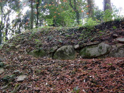 本郷駅から新高山城登り口まではタクシーで。560円。ここからは歩くしかない。10時に登城開始。本郷出発は13時23分予定。山道は整備はしてあるのだが広葉樹の落ち葉で滑る滑る。中腹にある匡真寺という寺の跡から先は一転岩肌を歩く。
