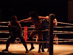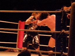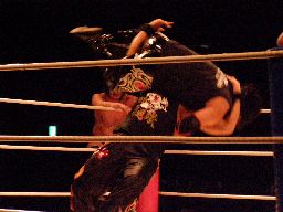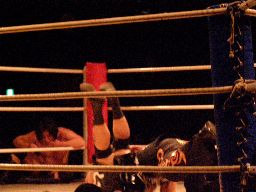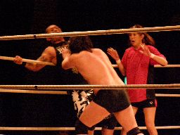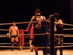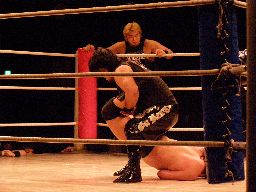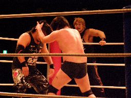NOSAWAリンギーナ(右写真)、大家ロープ。チョップの打ち合いから場外に放り出す。今度はMAZADAが客席に放り投げてイス攻撃。リングに戻す、NOSAWAカバー、カウント2。
