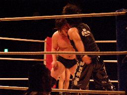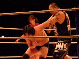NOSAWA首投げから大家の後頭部にサッカーボールキック、カウント2。MAZADAにタッチ。エルボーの打ち合い、MAZADA首投げからサミング、レフェリーのスキを突いてチョーク攻撃(左写真)。