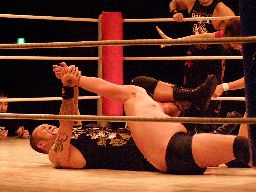 大家カミカゼ(右写真)、カウント2。ロープに飛ぶ、ラリアット、今度はかわして炎のスピアー、カウント2。