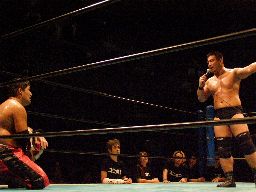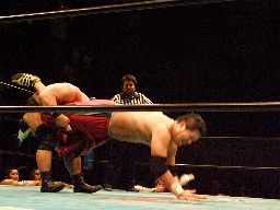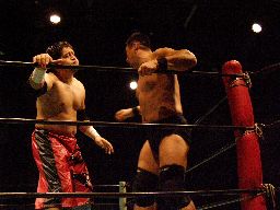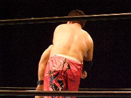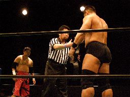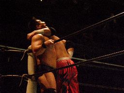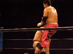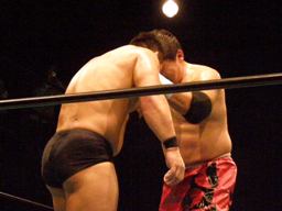 高木STFに(右写真)、石川ロープ。高木なかなか離さない。客席からはブーイング。