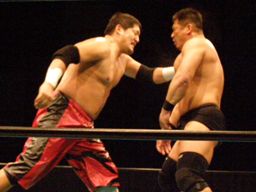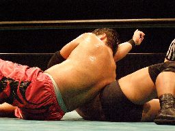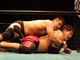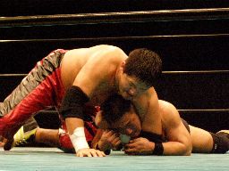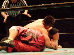 ロックアップ、石川がロープに押し込むがクリーンブレーク。再度ロックアップ、今度は高木がロープに押し込む、高木は離れ際に張り手一発。手四つ、石川がバック取る、高木カニばさみで倒しグラウンドヘッドロック、石川ネックロックに切り返す。高木切り返してバック取るとアマレスのローリングのような動き、石川上になってがぶる、バックに回ってヘッドロック(右写真)、高木返してフライングメイヤー、石川ヘッドシザーズ、ブレーク。