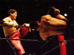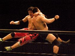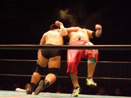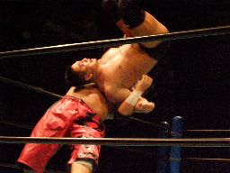 石川ロープに飛ぶ、高木カウンターのクローズライン(右写真)、カウント2。しかし高木も立ち上がれず両者にダウンカウントが数えられる。