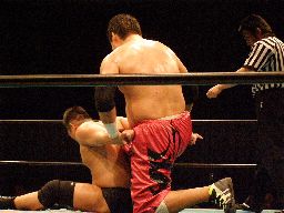 高木は場外に出てロープ越しのドラゴンスクリュー(右写真)、リングに戻ると足にドロップキック、カバー、カウント2。