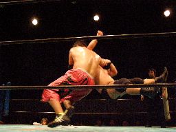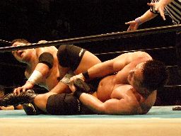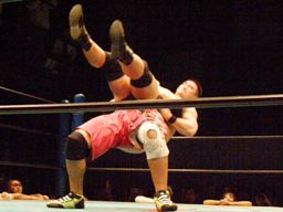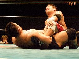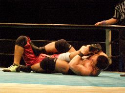 石川首投げからチキンウィング(右写真)、高木切り返すが石川は元に戻す。石川ヘッドロック、高木ロープに振る、石川ショルダーブロック、高木場外エスケープ。5分経過。