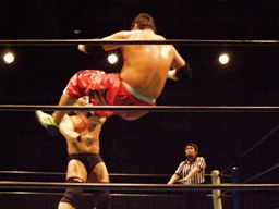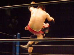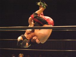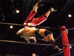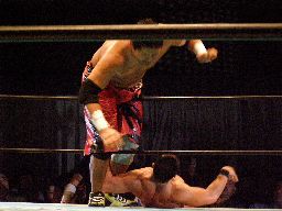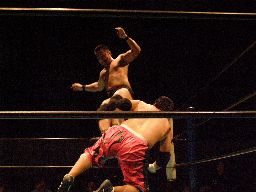 石川は高木を引き起こすとチョークスラムでターンバックルに叩き付ける。さらに串刺しラリアット浴びせてからセカンドコーナーに上るとミサイルキック(右写真)、カウント2。