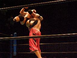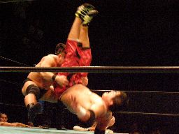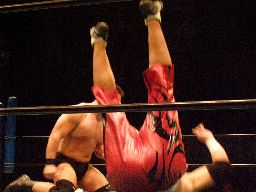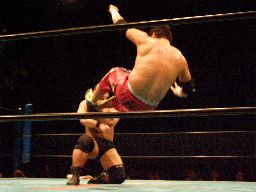 石川コーナーに振って突っ込む、高木かわしてクローズライン、石川かわして肩固めの体勢に高木をキャッチ、その体勢から高木を持ち上げてマットに叩き付ける(右写真)。