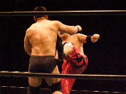 両者8で立ち上がる。高木はスタナーに行くが石川ブロックしてロープに飛ばす。帰ってきたところに石川ビッグブーツ、張り手、ヘッドバット(左写真)、この一撃で高木の額が割れ流血。