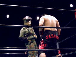 最初の入場は控室で「第1試合だけじゃ物足りない」と口走ってしまい急遽参戦させられることになった北海道代表・斗猛矢。2番目は茨城県代表・ササメ。試合開始。ロックアップ、斗猛矢がヘッドロック、ササメロープに振る、斗猛矢ショルダーブロック。ササメエルボードロップ、カウント1。ササメロープに振ってエルボー、スリーパー(右写真)。斗猛矢はヒジでブレーク。