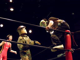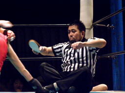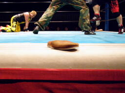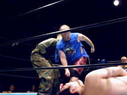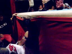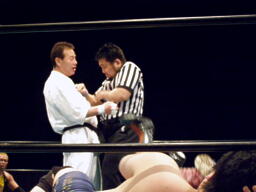 小笠原先生は松井レフェリーに暴行(右写真)。レフェリーの座を狙っているのか?しかしガイジンAが小笠原先生をオーバー・ザ・トップロープで失格させる。