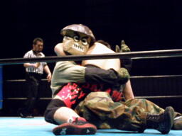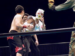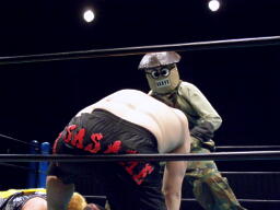 ガイジンAは椎茸男のマスクの前後引っくり返し急所打ち(左写真)、カウント3。