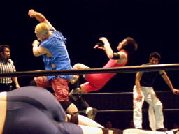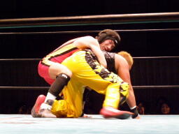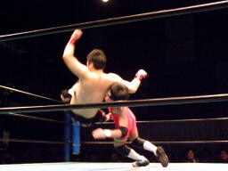 6番目に神奈川県代表のED JUMP入場。特徴ない見掛けだなあ。椎茸男ネックロックに(左写真)。