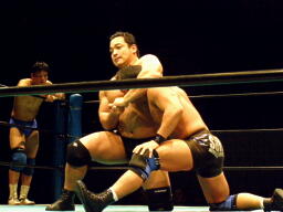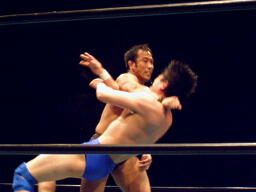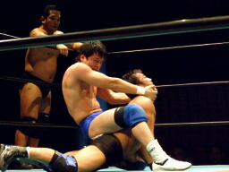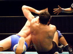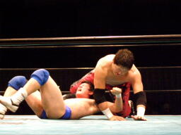 晋也コーナーに振って串刺しエルボー、カウント2。胴締めスリーパーに(右写真)、修司がカット。晋也は関本にタッチ。