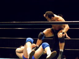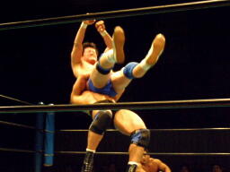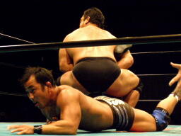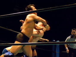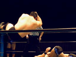 諸橋が晋也にジャーマン3連発(右写真)、コーナーに上ってダイビングヘッドバット、カウント2。諸橋クリップラー・クロスフェース狙う、関本カット。修司が関本を場外に出して乱闘。