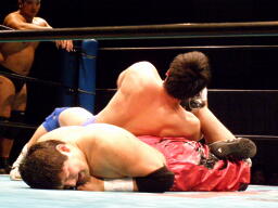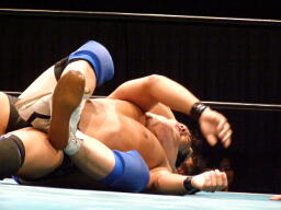 晋也裏投げ狙う、諸橋ブロック、晋也は卍固め(右写真)。
