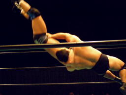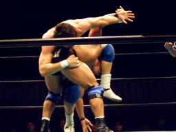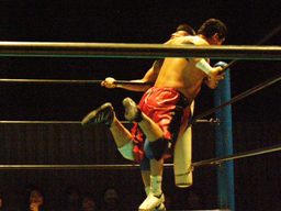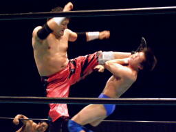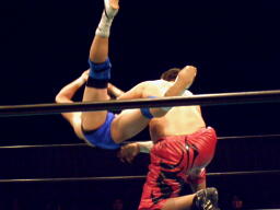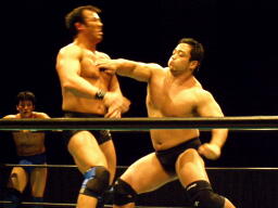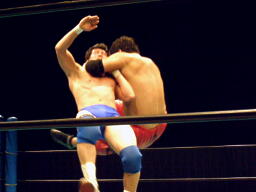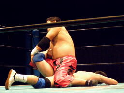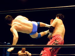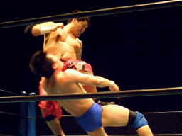 ロープに飛んでランニングニーリフト(右写真)、カバーに行った修司を関本がぶっこ抜きジャーマン、修司場外エスケープ。