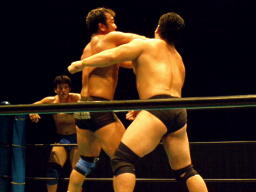 先発は諸橋と関本。ロックアップ、関本が押し込む、ブレーク。再度ロックアップ、関本ヘッドロックからフライングメイヤー、諸橋立ち上がりロープに振ろうとするが関本は振らせない(右写真)。諸橋ヒジでブレークしてロープに振る、関本ショルダーブロック。関本首投げからスリーパー、諸橋切り返してストンピング。手四つ、最初関本が押し込むが諸橋盛り返す。関本は晋也にタッチ。