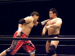 修司ブレーンバスター、晋也背後に着地してロープに飛ぶ、修司はカウンターでジャイアントブーツ(右写真)。