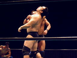 諸橋が関本をジャーマン(左写真)、関本も場外エスケープ。修司リングに戻り諸橋にタッチ。