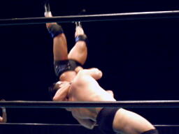 エルボーの打ち合い、晋也突っ込む、諸橋キャッチしてクリップラー・クロスフェース(右写真)、晋也ギブアップ。