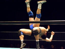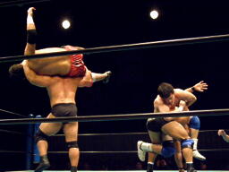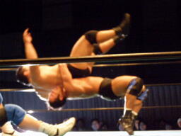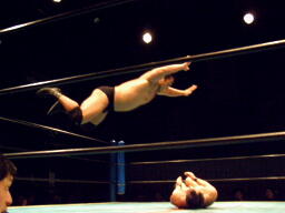 晋也がボディスラム、関本コーナーからフロッグスプラッシュ(右写真)、晋也がカバー、修司カット。関本が修司を場外に出す。