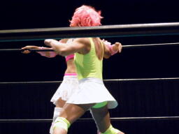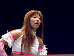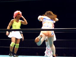 さくらヘアホイップ2連発(左写真)、ボディスラムからカバー、カウント2。首投げからカバー、カウント2。ジャンプしてボディプレス、カウント2。ストンピング。マサ子にタッチ。