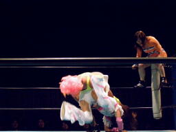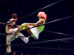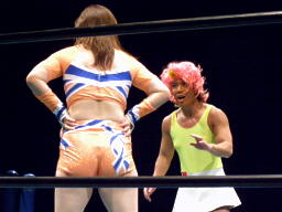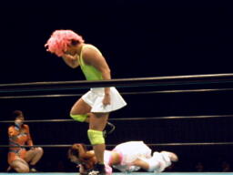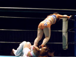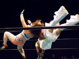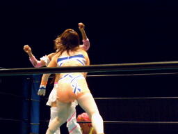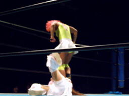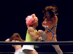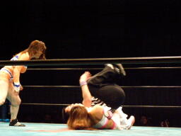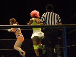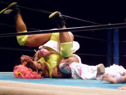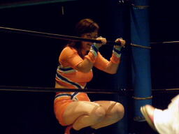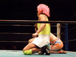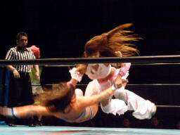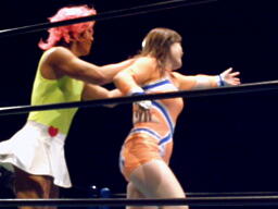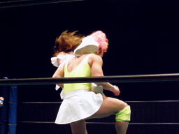 チェリーとさくらロックアップからエルボー打ち合い(左写真)。チェリーコーナーに振る、さくらコーナーに上る。チェリーキックで落とす。チェリートペ狙ってロープに飛ぶ、マサ子が足引っ張る。