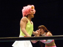 しかしさくらはコーナーに下がって落ち込む(左写真)。マサ子首投げからドロップキック、カウント2。さくらにタッチ。