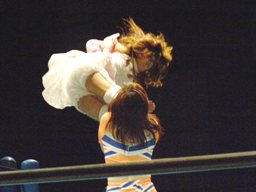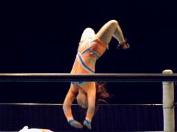 チェリー大外刈り(右写真)。マサ子入ってダブルでロープに振る、チェリー側転、しかしさくらにぶつかりそうになる。