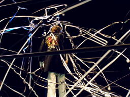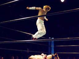 イサミボディスラム、トップロープからバルコニーに移動し、そこからダイビングダブルニードロップ(右写真)。この会場ならではの超必殺技、しかし大石は2で返す。