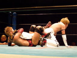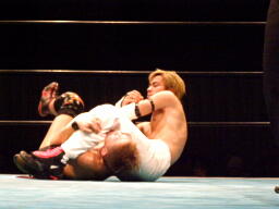 大石ミラクルエクスタシー(左写真)、カウント2でイサミが返したところを足をキャッチしてヒザ十字。