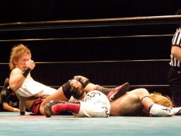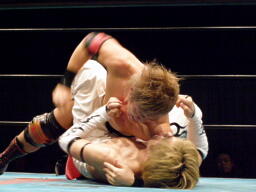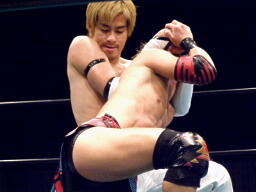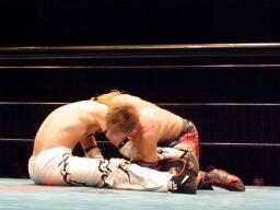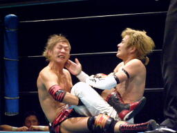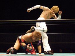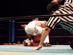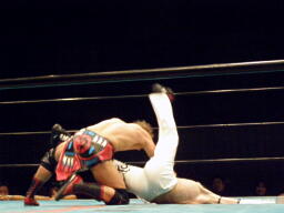 イサミさらに切り返して倒立させると軍鶏(左写真)、ちょっと浅かったか。大石首固め、カウント2。
