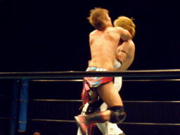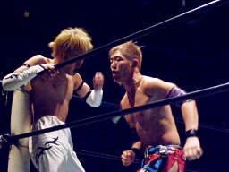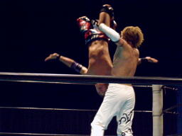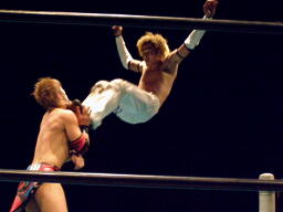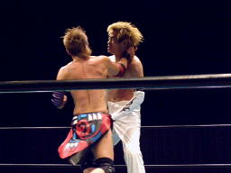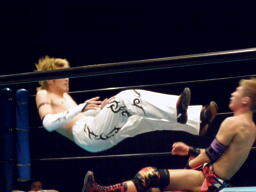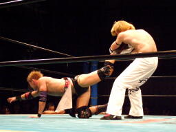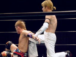 イサミ弐次元(右写真)、コーナーに上る。大石起き上がってコーナーに上るとエルボー、イサミヘッドバットで落とす。