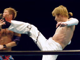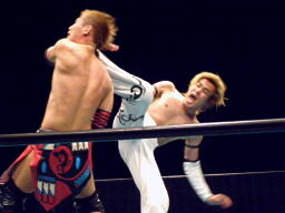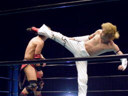イサミハイキック、大石低空ドロップキック、イサミトラースキック(右写真)、両者ダウン。10分経過。