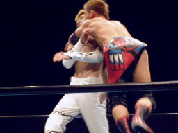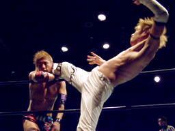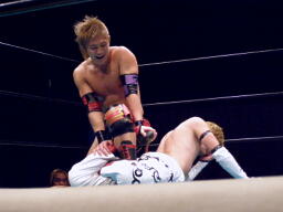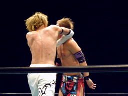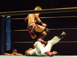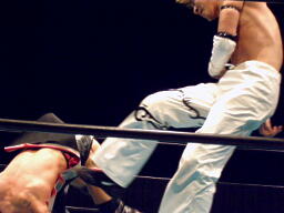 イサミコーナーに上ってミサイルキック(左写真)、カウント2。イサミボディスラム、再度コーナーに上ってダイビングダブルニードロップ、大石かわす。