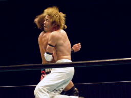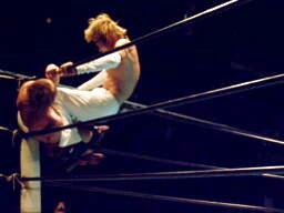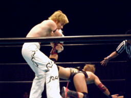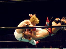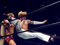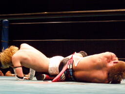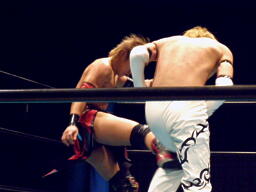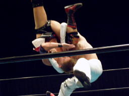 イサミロープに近づく、大石リング中央に戻して再度ヒザ十字決める(右写真)、イサミ粘るがついにタップ。