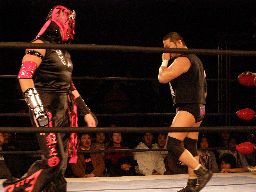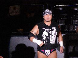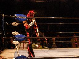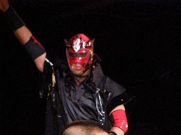 天狗たけし入場。リングネームの通り天狗のお面(左写真)。MIKAMIを思い出させるなあ。