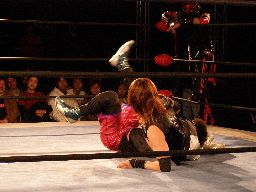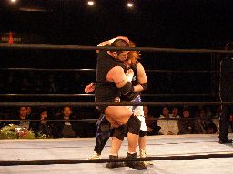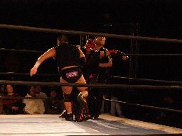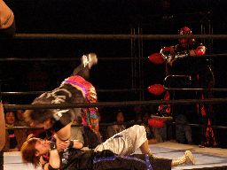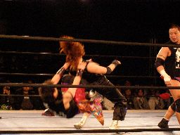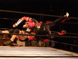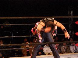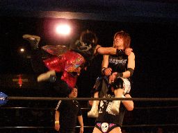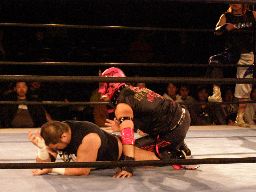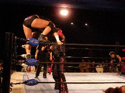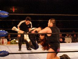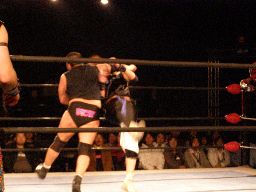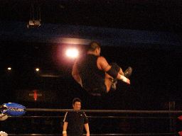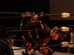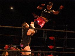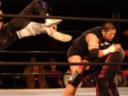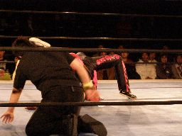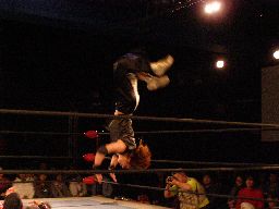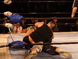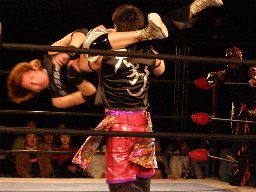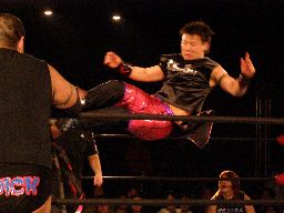ロープワークからHAYATAがリープフロッグ、コルバタ(右写真)。HAYATAロープに飛ぶ、東郷がエプロンからキック、場外に出す。客席に投げ込む。たけしもHANZOと場外戦。5分経過。