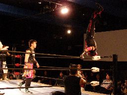 HANZOコーナーに振る、たけし切り返す、HANZOコーナーで倒立(右写真)。たけしが近づくとヘッドシザーズに。さらにサマーソルトドロップ、カウント2。HAYATAにタッチ。HAYATA腕を取る、たけしコーナーに押し込んで東郷にタッチ。
