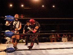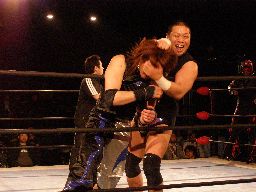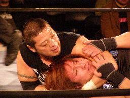 東郷はヘッドロックから顔面にナックル(右写真)。フィストドロップ、カウント2。10分経過。