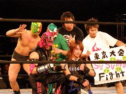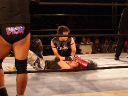 HANZOが入るがレフェリーごとコーナーに押し込んで東郷がパンチ(左写真)。レフェリー倒れる。