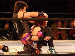 たけしがHAYATAをロープに固定、東郷がエプロンからトラースキック(左写真)、たけし619、カウント2。フェースクラッシャーからカバー、カウント2。東郷にタッチ。