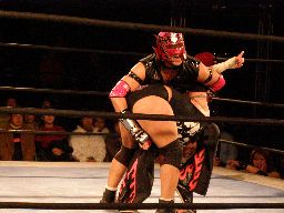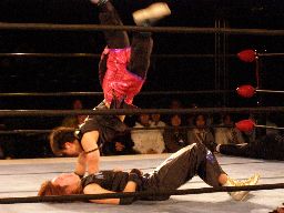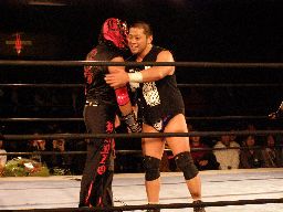 東郷HAYATAにペディグリーからコーナーに上る、HANZOがデッドリードライヴ(右写真)。