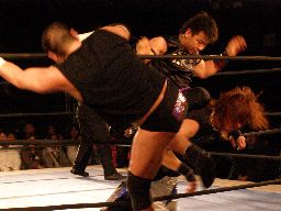 東郷がHAYATAを肩車、たけしがコーナーから飛んでのダブルインパクト(右写真)、カウント2。